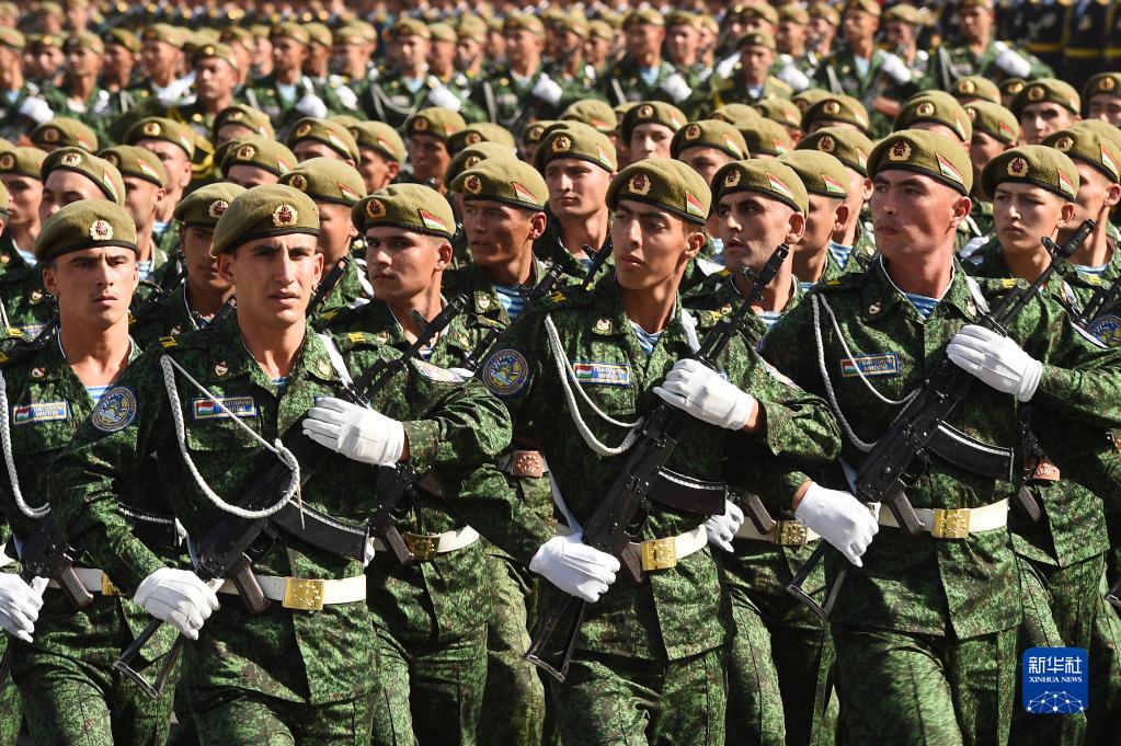 9月7日,塔吉克斯坦官兵在杜尚别举行的阅兵仪式上接受检阅。