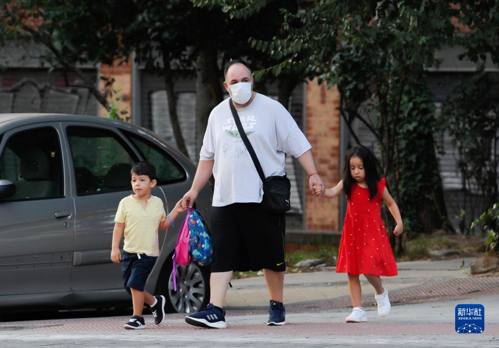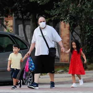 9月8日,一名家长在西班牙马德里送孩子上学。