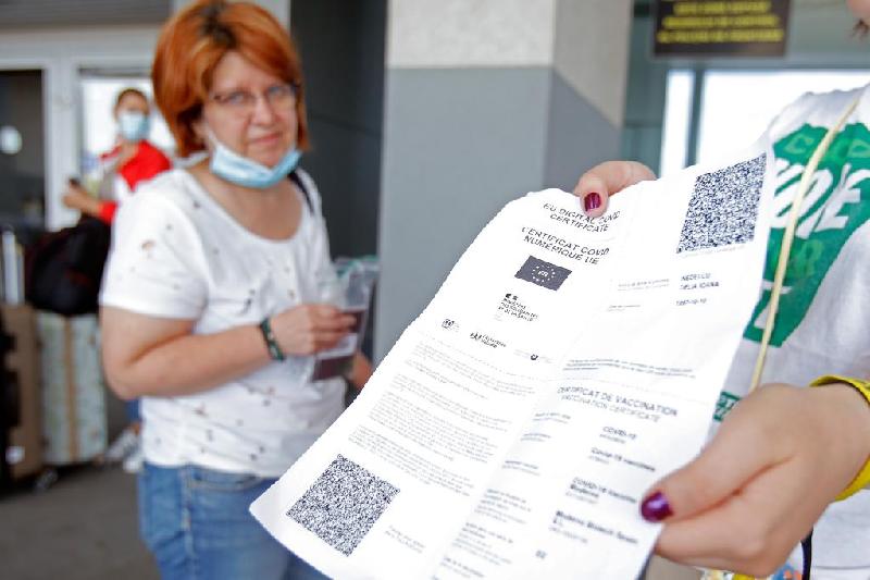 8月13日,一名女子在罗马尼亚首都布加勒斯特附近的亨利·科安德国际机场出示其带有二维码的欧盟数字新冠通行证。新华社发(克里斯泰尔摄)
