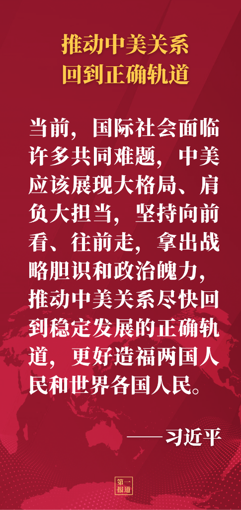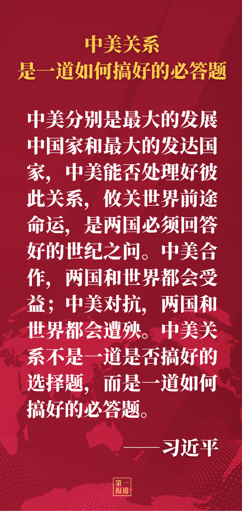 习近平指出,一段时间以来,美国采取的对华政策致使中美关系遭遇严重困难,这不符合两国人民根本利益和世界各国共同利益。中美分别是最大的发展中国家和最大的发达国家,中美能否处理好彼此关系,攸关世界前途命运,是两国必须回答好的世纪之问。中美合作,两国和世界都会受益;中美对抗,两国和世界都会遭殃。中美关系不是一道是否搞好的选择题,而是一道如何搞好的必答题。