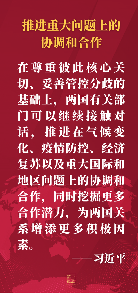 习近平阐述了中方在气候变化等问题上的立场,强调中方坚持生态优先、走绿色低碳的发展道路,一直积极主动承担同自身国情相符的国际责任。在尊重彼此核心关切、妥善管控分歧的基础上,两国有关部门可以继续接触对话,推进在气候变化、疫情防控、经济复苏以及重大国际和地区问题上的协调和合作,同时挖掘更多合作潜力,为两国关系增添更多积极因素。