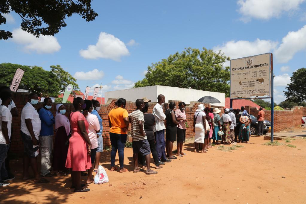 这是3月24日,民众在津巴布韦维多利亚瀑布城一家医院门口排队等待接种中国国药集团新冠疫苗。新华社发(陈雅琴摄)