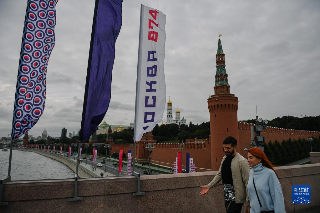 9月11日,在俄罗斯首都莫斯科,人们经过城市日旗帜。