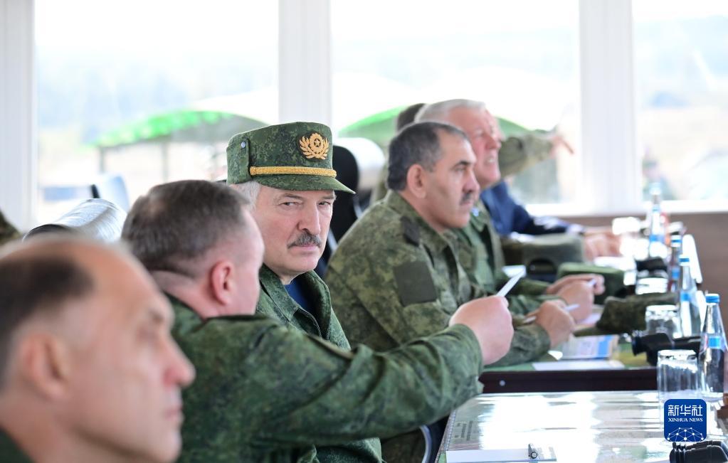 9月12日,在白俄罗斯布列斯特州,白俄罗斯总统卢卡申科(中)视察“西部-2021”联合战略演习。