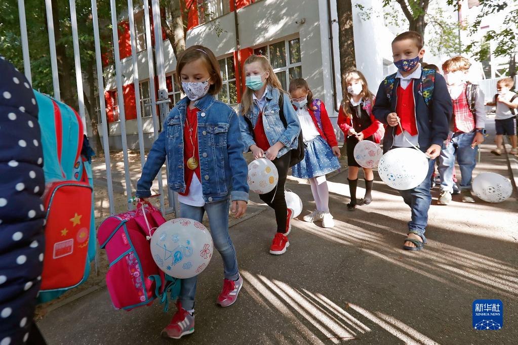 9月13日,在罗马尼亚首都布加勒斯特,学生进入学校参加新学期开学典礼。当日,罗马尼亚全国中小学开学,由于疫情日趋严重,政府要求所有人员必须戴口罩。