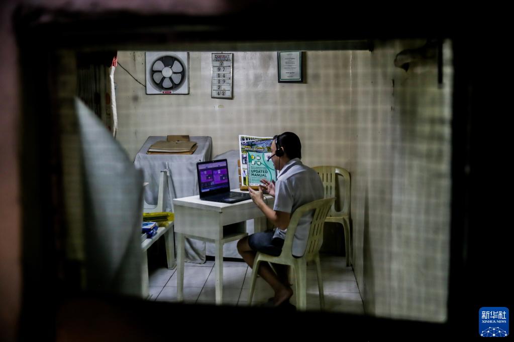 9月13日,在菲律宾马尼拉,教师卡尔文·埃罗尔·阿尔坎塔拉在2021-2022学年开学第一天通过网络为学生上课。当日,菲律宾教育部门通过网络、电视和电台等形式开启了新学年的教学。