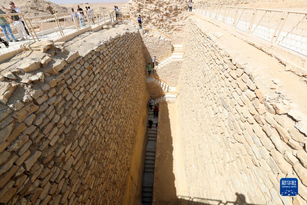 9月14日,游客在埃及首都开罗以南的塞加拉地区一座左塞尔时期古墓墓道内游览。