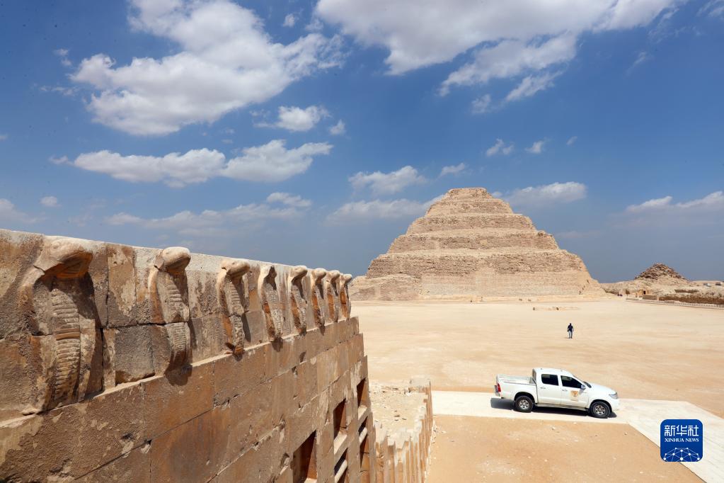 这是9月14日在埃及首都开罗以南的塞加拉地区一座左塞尔时期古墓的地上建筑拍摄的眼镜蛇雕像,以及远处的阶梯金字塔。