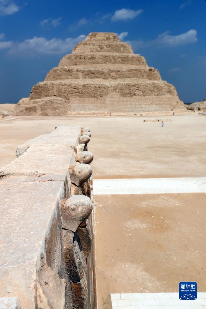 这是9月14日在埃及首都开罗以南的塞加拉地区一座左塞尔时期古墓的地上建筑拍摄的眼镜蛇雕像,以及远处的阶梯金字塔。