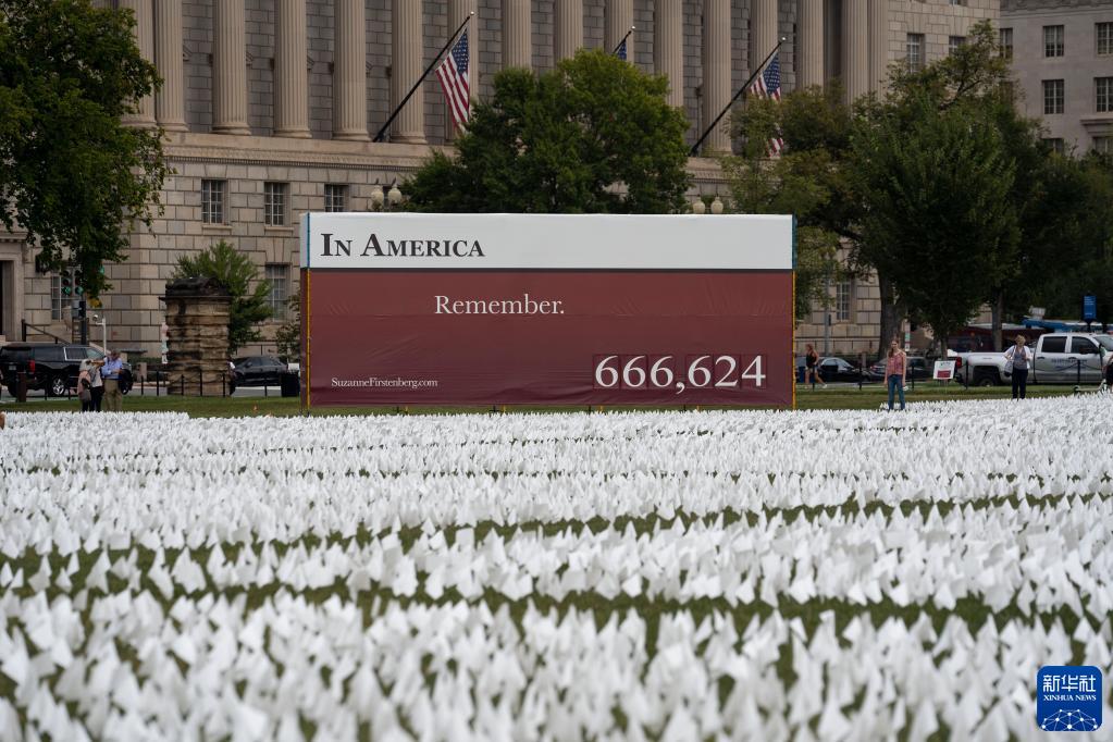 9月16日,在美国首都华盛顿,白色旗帜摆放在草坪上悼念新冠逝者。