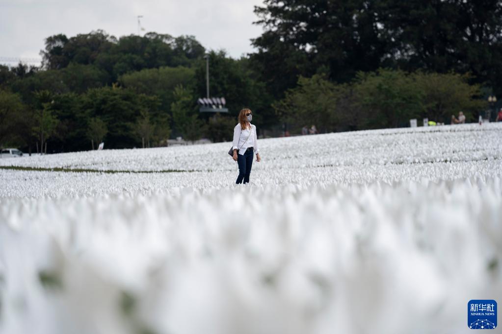 9月16日,在美国首都华盛顿,一名女子从草坪上的白色旗帜旁走过。