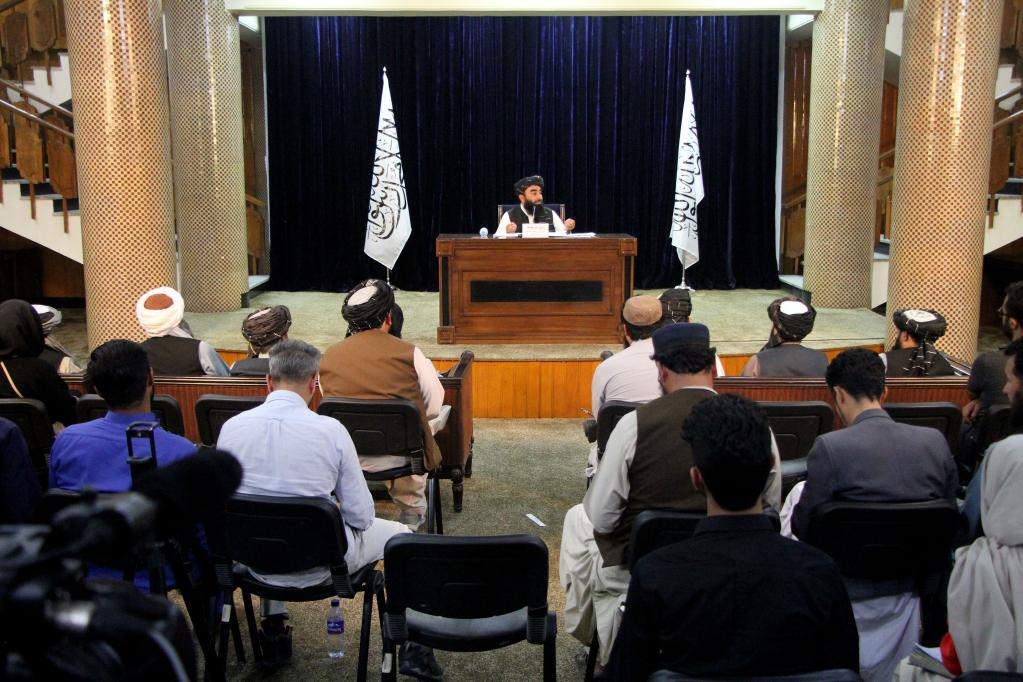 9月7日,阿富汗塔利班发言人穆贾希德在喀布尔出席记者会。当日,穆贾希德在喀布尔举行的记者会上表示,塔利班决定组建临时政府,并公布了临时政府主要成员。新华社发(塞夫拉赫曼·萨菲 摄)