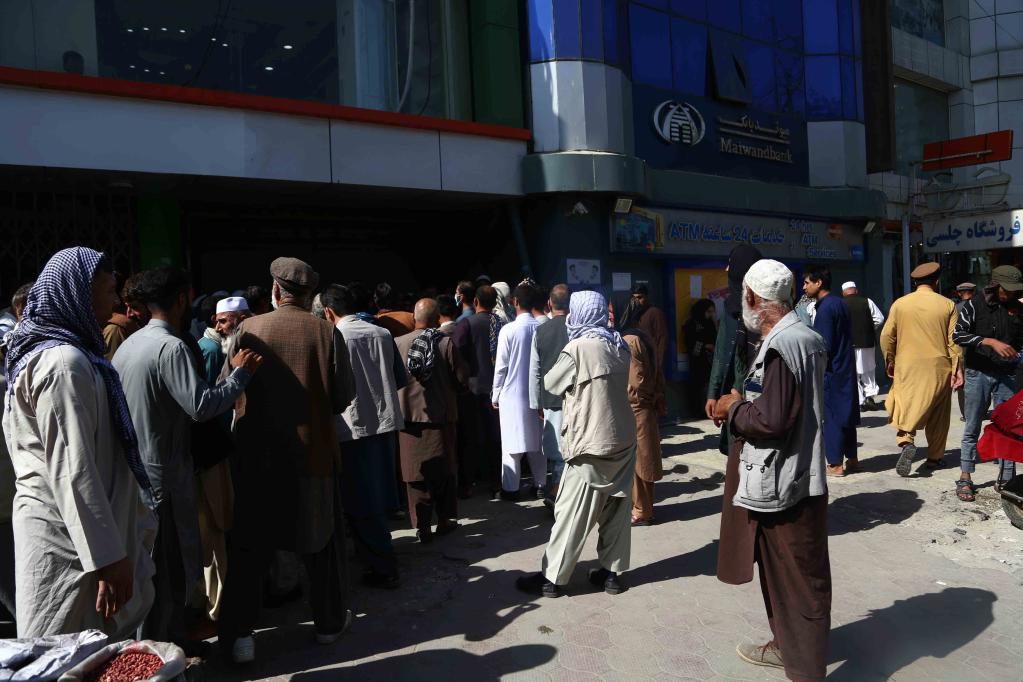 9月15日,在阿富汗首都喀布尔,人们在一家银行外排队取钱。新华社发