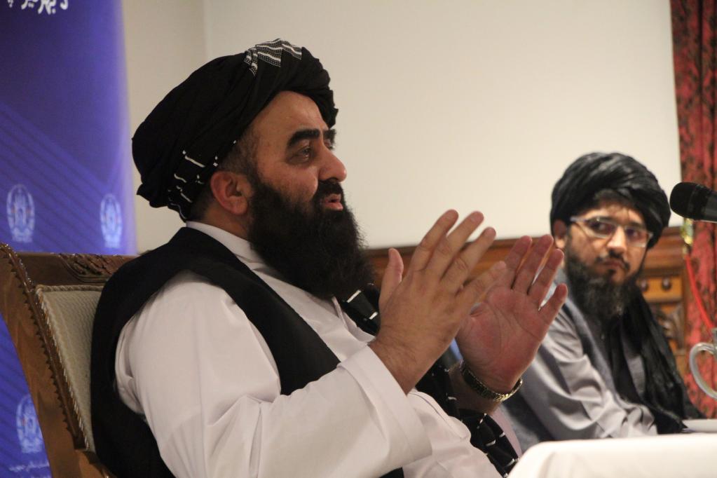 9月14日,塔利班临时政府代理外交部长阿米尔·汗·穆塔基在阿首都喀布尔举行的记者会上对国际社会提供援助表示感谢。新华社发(塞夫拉赫曼·萨菲 摄)