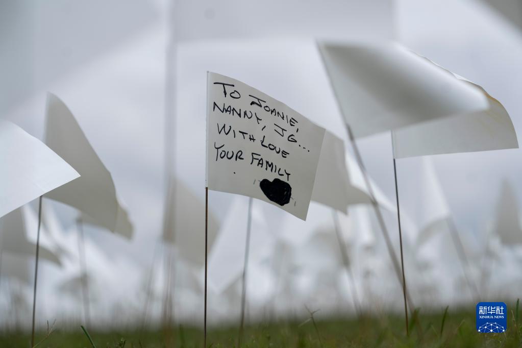 9月17日,写有缅怀亲人词句的白色旗帜摆放在美国首都华盛顿的华盛顿纪念碑附近的草坪上,悼念美国超过66万名新冠逝者。