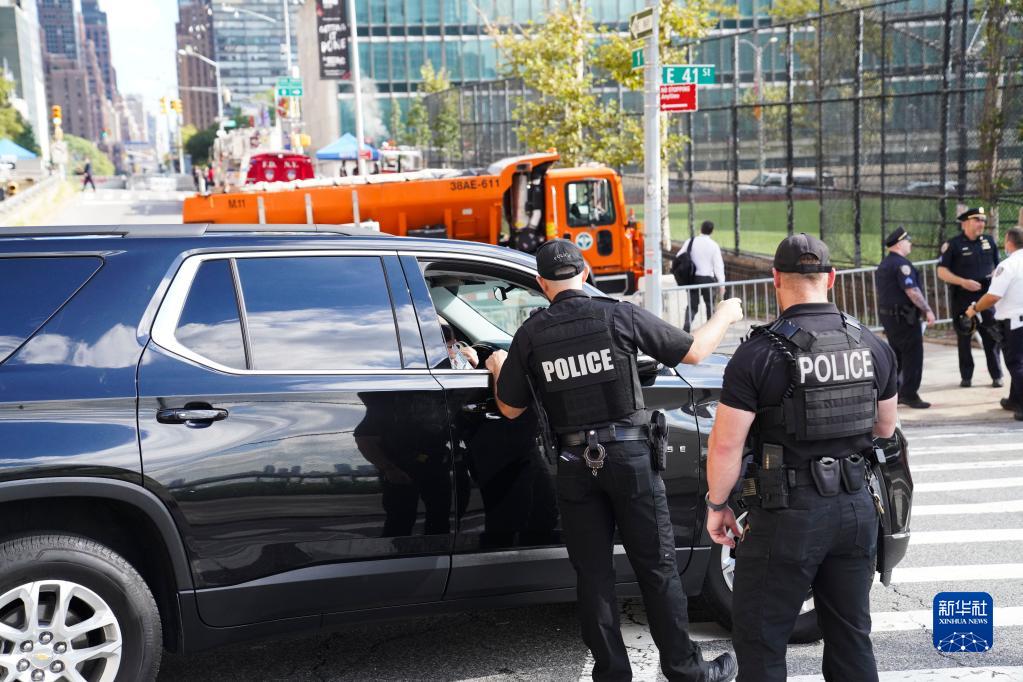 9月20日,警察在纽约联合国总部附近的街道上检查车辆证件。