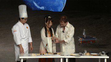 第二个挑战落到了高导身上,在月球上做月饼?怎么实现?在新华社新立方智能化演播室,借助“MR+AR”技术,主持人和面点师一起站到“月球表面”,现场教学月饼制作,周围还环绕着月球探测器,十分逼真。