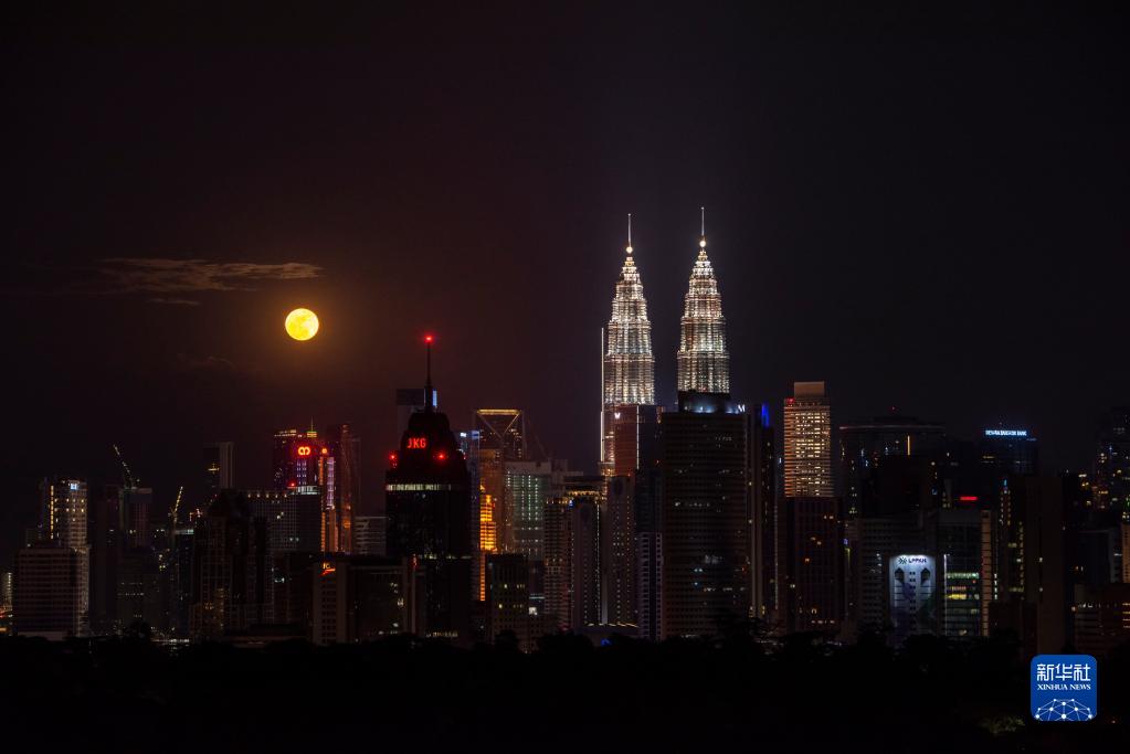9月21日,中秋圆月映衬着马来西亚吉隆坡城市夜景。新华社发(张纹综摄)