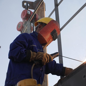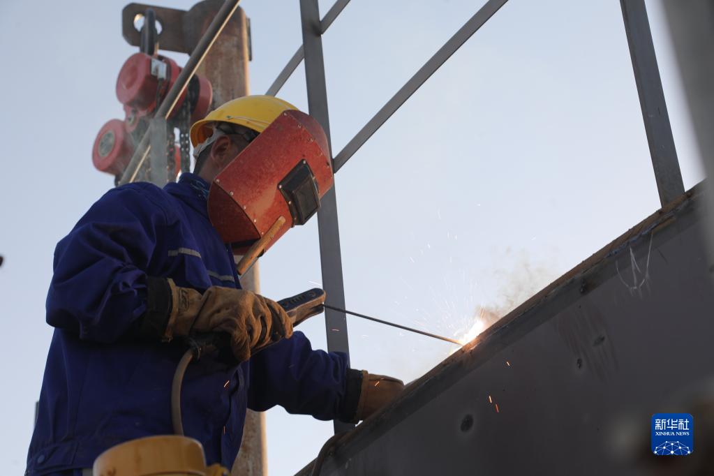 9月21日,在伊拉克米桑油田,一名中国工人在水处理厂三期项目施工现场进行焊接作业。新华社发