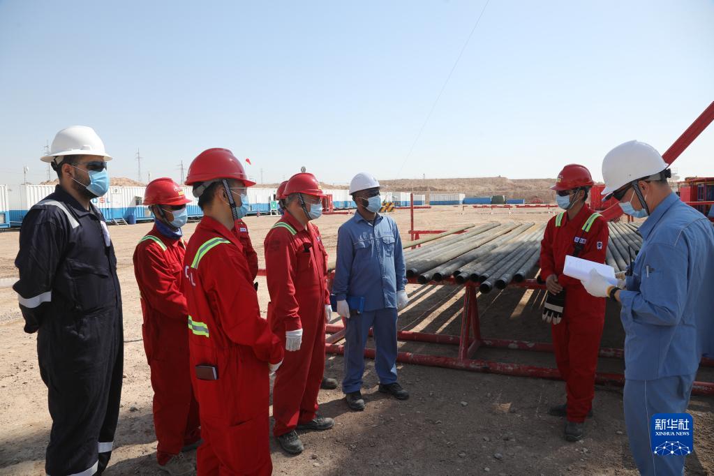 9月21日,在伊拉克米桑油田,工程师王寿鑫(右一)与中伊双方井队人员进行技术沟通。新华社发