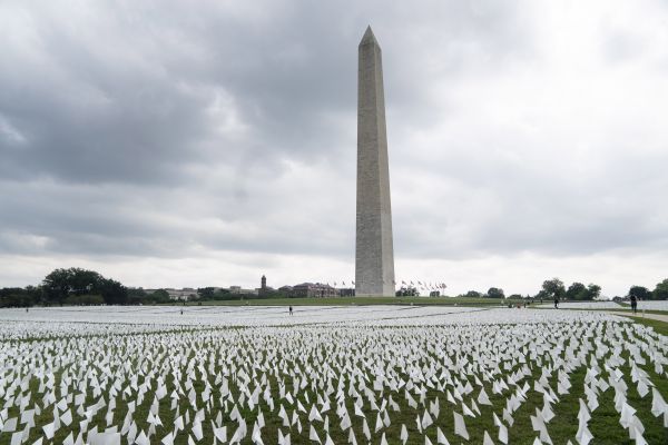 9月16日,在美国首都华盛顿,白色旗帜摆放在草坪上悼念新冠逝者。新华社记者 刘杰 摄