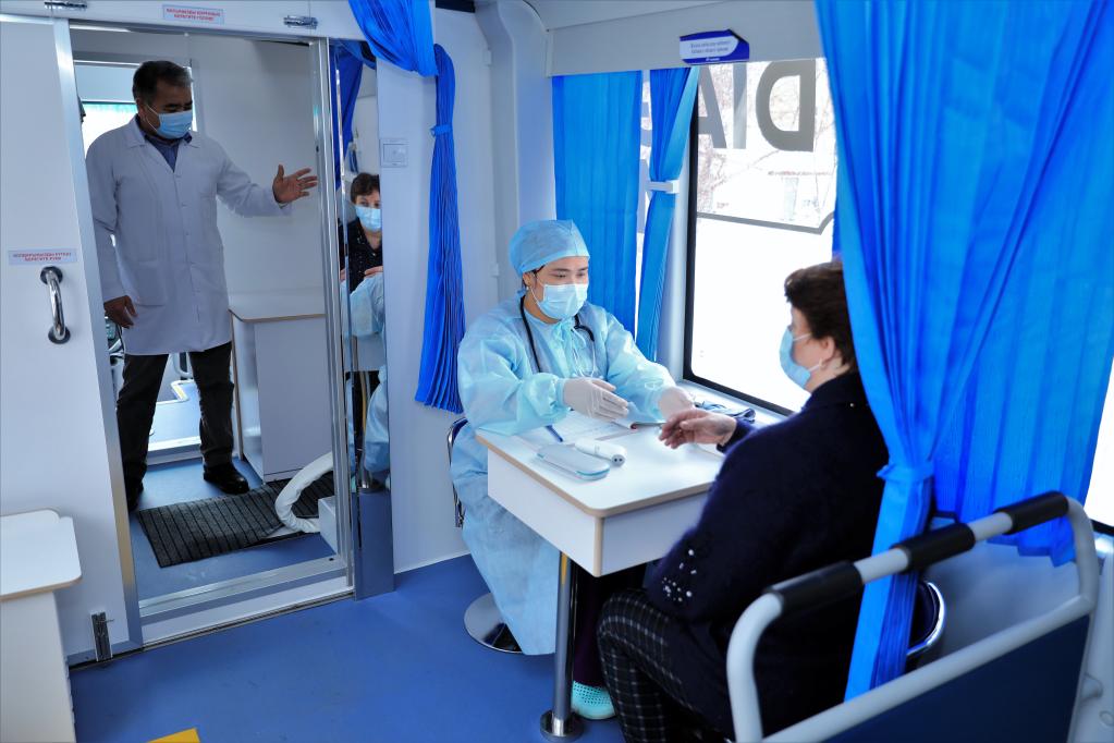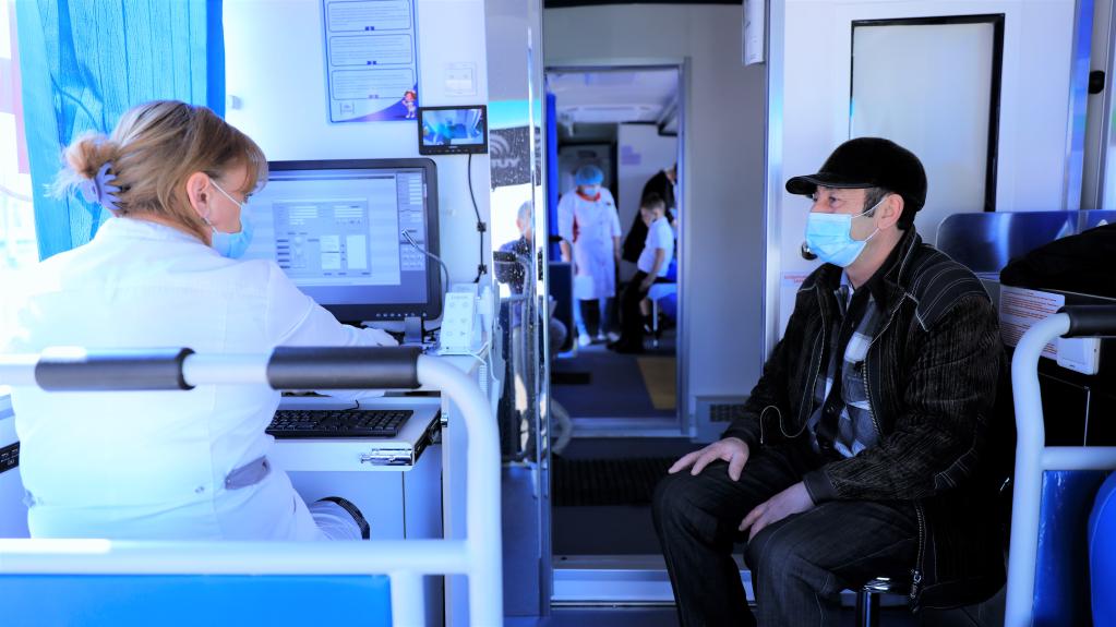 4月23日,在哈萨克斯坦图尔根村,当地居民在医疗车中接受诊疗。新华社发(奥斯潘诺夫摄)
