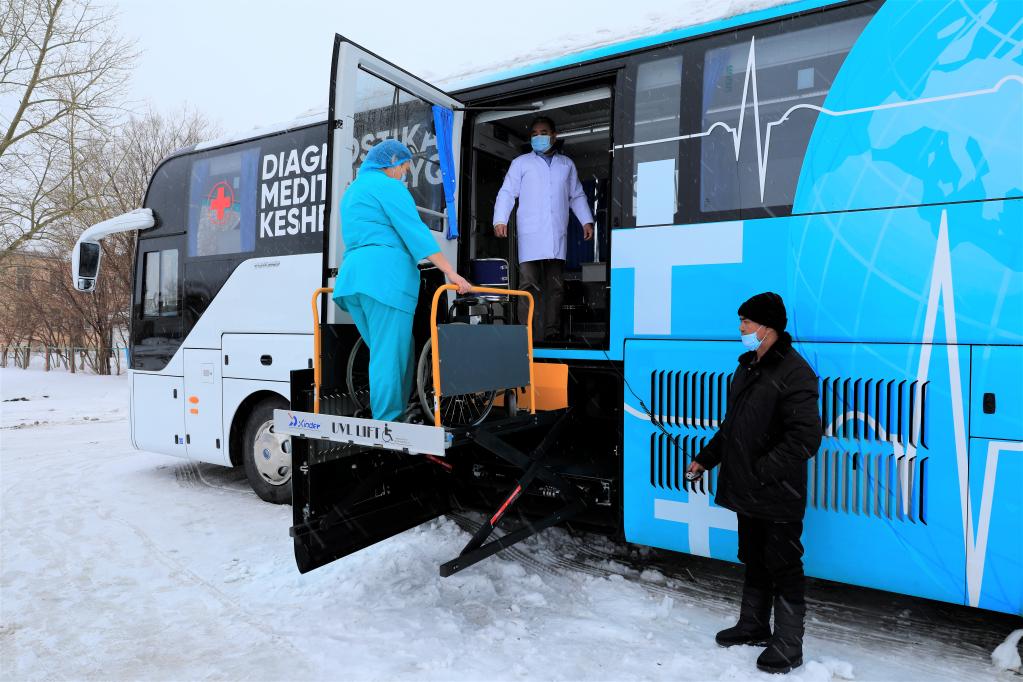 3月10日,工作人员在哈萨克斯坦阿克莫州地方医院展示移动医疗车具有的无障碍功能。新华社发(奥斯潘诺夫摄)