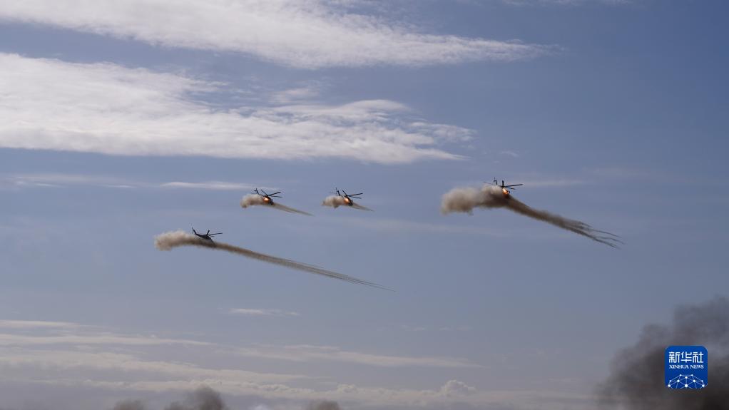 9月23日,在俄罗斯奥伦堡州东古兹靶场举行的“和平使命-2021”上海合作组织联合反恐军事演习实兵实弹演习中,多国联合部队陆航作战力量发射火箭弹。新华社记者 梅世雄 摄
