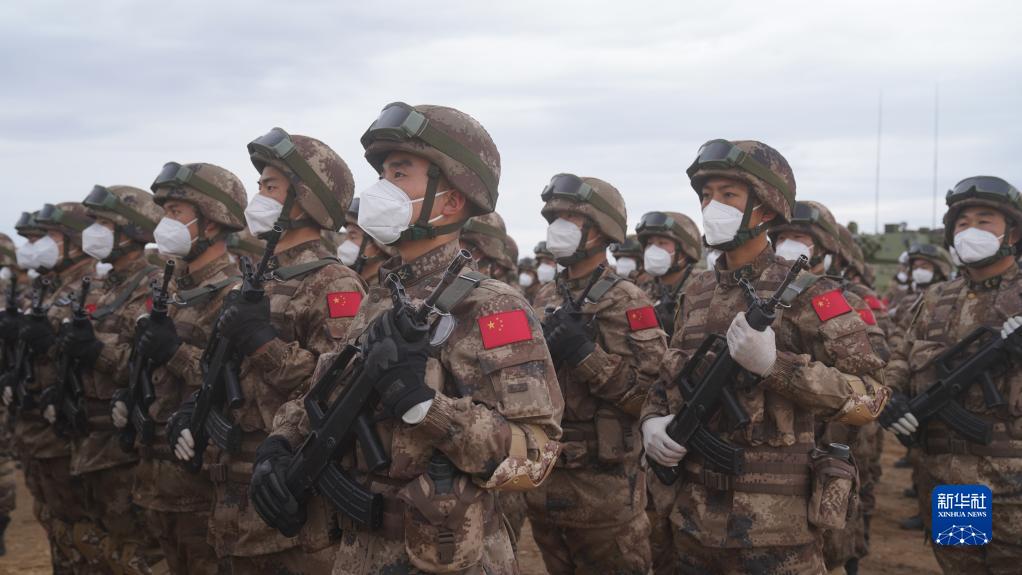 9月24日,在俄罗斯奥伦堡州东古兹靶场举行的“和平使命-2021”上海合作组织联合反恐军事演习闭幕式上,中方参演部队方队接受检阅。新华社记者梅世雄摄