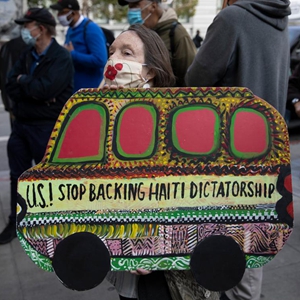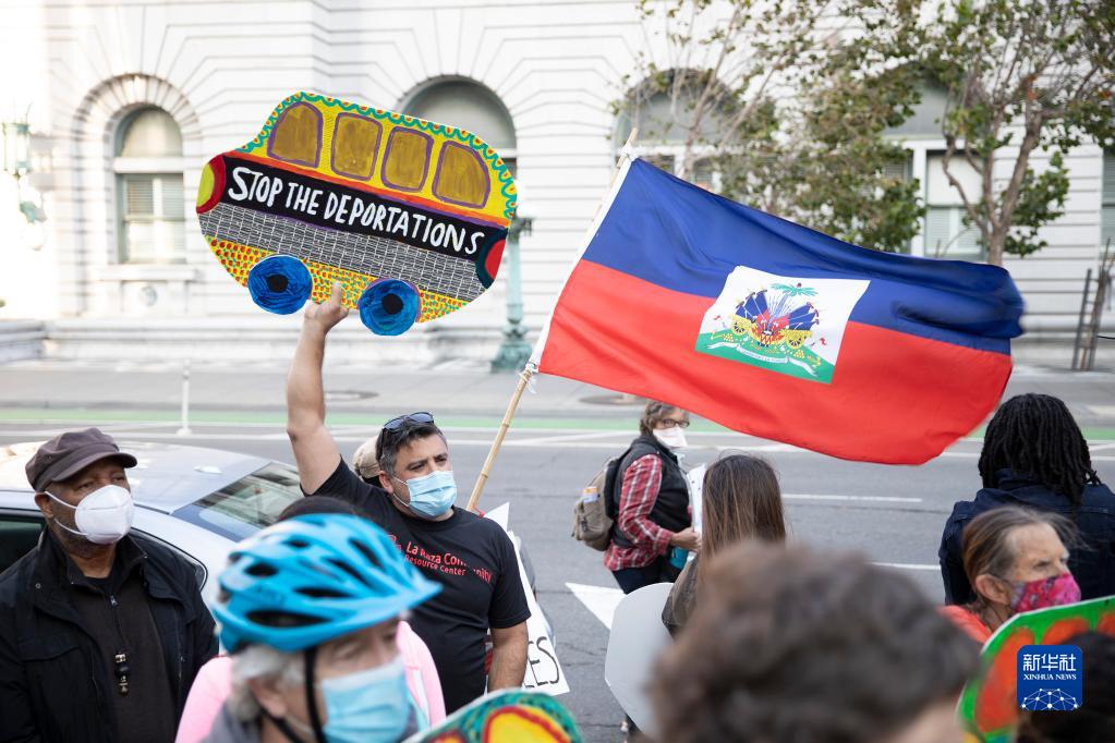9月24日,民众在美国旧金山抗议美国政府驱逐海地难民。