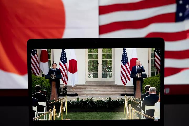 4月16日拍摄的直播画面显示,美国总统拜登(右)与到访的日本首相菅义伟在美国华盛顿白宫举行联合记者会。 新华社记者刘杰摄