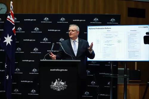 5月29日,在澳大利亚堪培拉的国会大厦,澳大利亚总理莫里森出席新闻发布会。新华社发(储晨摄)