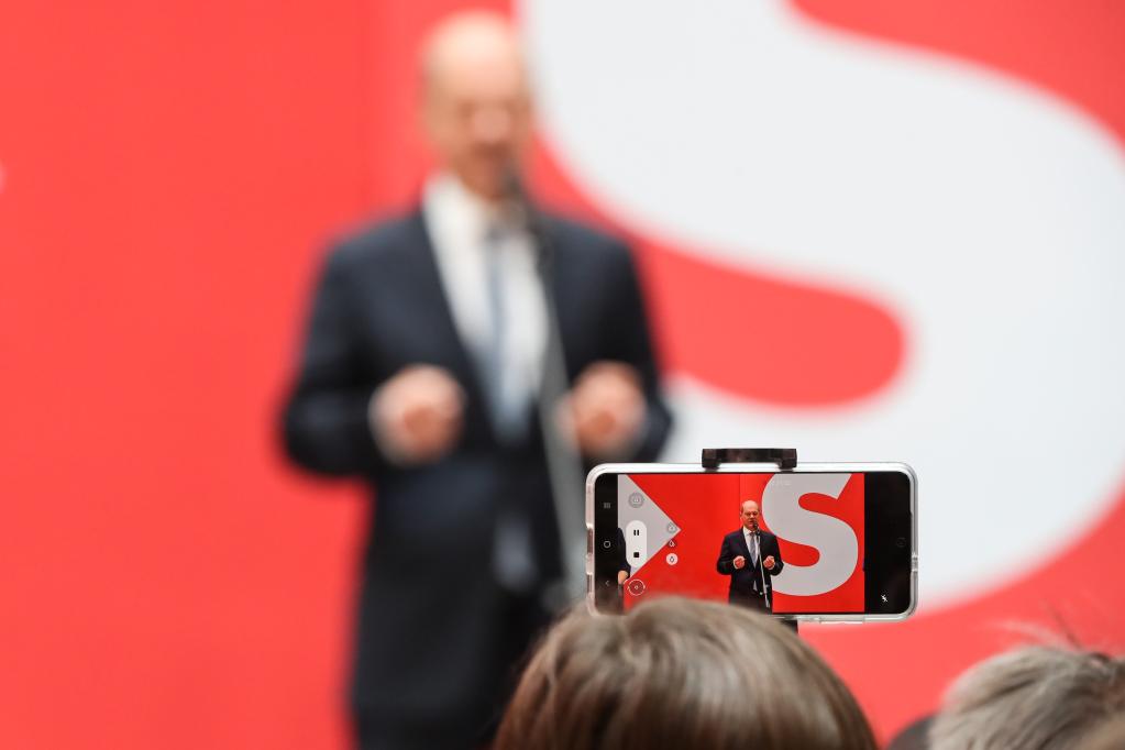9月27日,在德国首都柏林的社民党总部,一名媒体记者用手机拍摄社民党总理候选人朔尔茨出席新闻发布会。