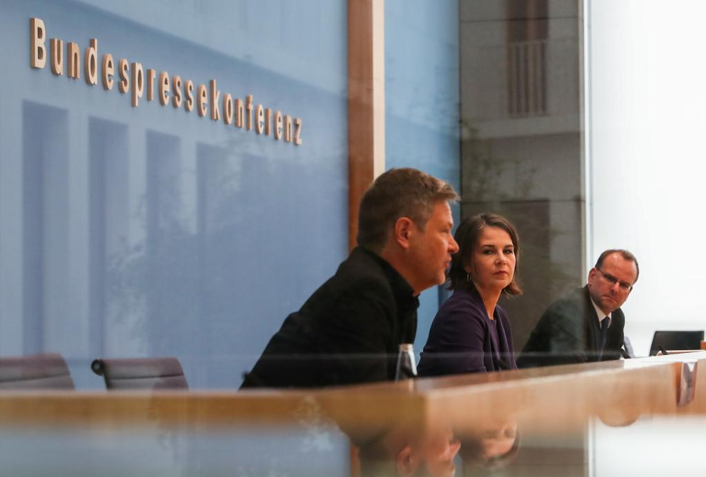 9月27日,德国绿党主席、总理候选人贝尔伯克(中)与绿党联席主席哈贝克(左)在柏林出席新闻发布会。
