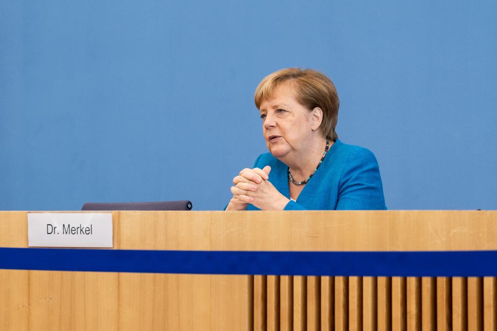2020年8月28日,在德国首都柏林,德国总理默克尔出席夏季记者会。她在回答新华社记者提问时表示,德国在担任欧盟轮值主席国期间,将推动欧中进一步加强合作。欧盟期待与中国在应对气候变化、第三方市场等方面有更多合作,同时希望欧中投资协定谈判取得新进展。(新华社记者 任珂 摄)