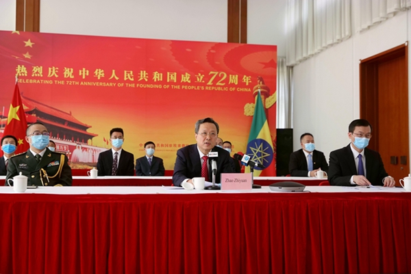 9月28日,在埃塞俄比亚首都亚的斯亚贝巴,中国驻埃塞俄比亚大使赵志远在线上国庆招待会上发表讲话。记者 汪平 摄