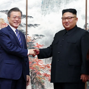 资料图片:2018年9月19日,在朝鲜平壤,朝鲜国务委员会委员长金正恩(右)与韩国总统文在寅在举行共同记者会后握手。新华社发