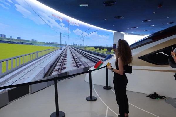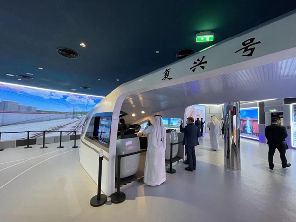 观众可以进入等比例的驾驶舱,模拟驾驶“复兴号”高铁,体验从北京出发,途经上海、阿布扎比抵达迪拜世博园区的虚拟路线。