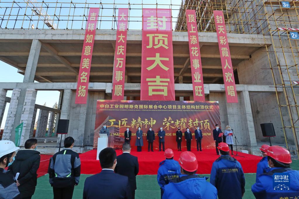 当日,中企投资的中白工业园明斯克国际展会中心项目顺利封顶,中白双方现场举行封顶仪式。新华社发(任科夫摄)