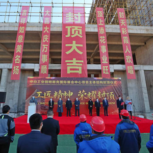 这是10月4日在白俄罗斯明斯克拍摄的中白工业园明斯克国际展会中心项目封顶仪式现场。