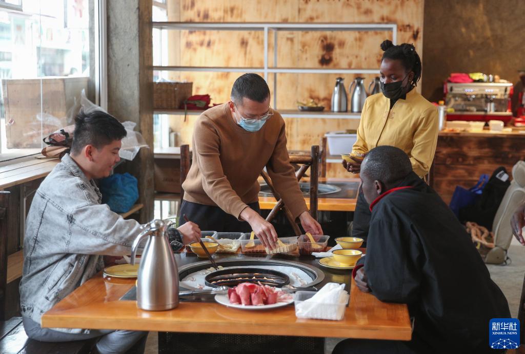 7月10日,张仁全(左二)在肯尼亚内罗毕的餐厅内为顾客服务。新华社记者 龙雷 摄