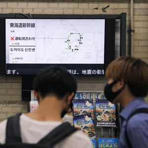 10月7日,在日本东京,人们关注一个车站前屏幕上的信息,上面显示新干线线路暂停运营。据日本气象厅消息,日本千叶县西北部7日晚发生6.1级地震,东京地区震感强烈。新华社记者杜潇逸摄