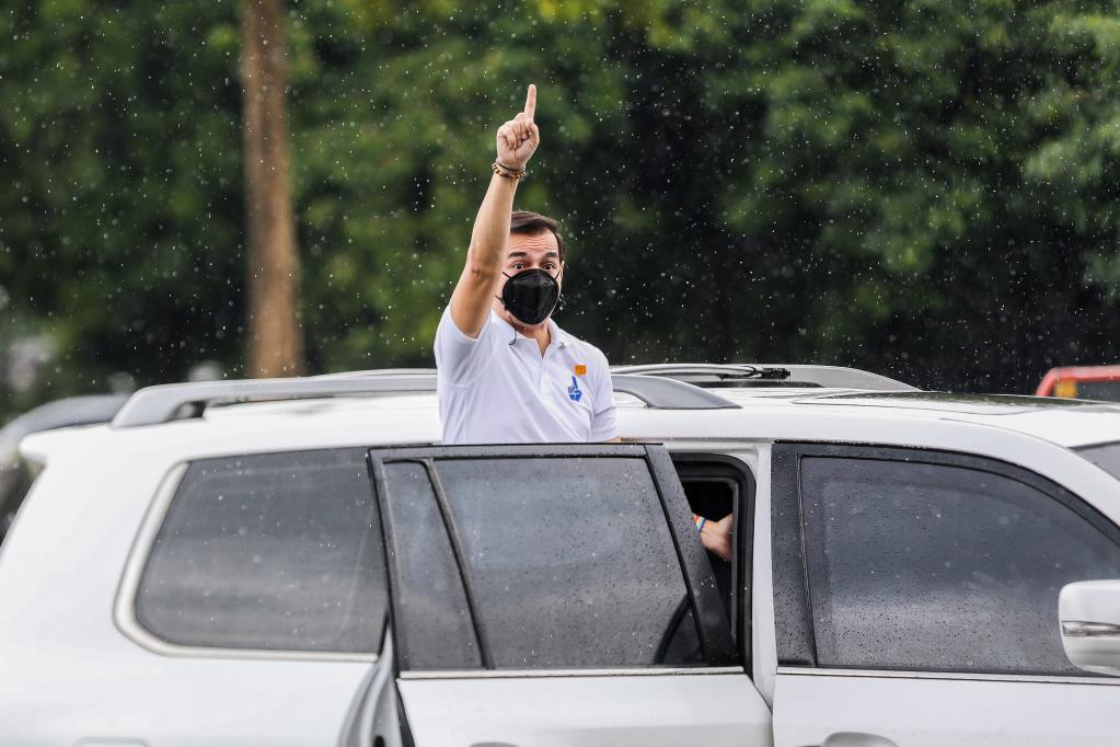10月4日,马尼拉市长弗朗西斯科·多玛戈索在提交2022年总统选举候选人证书后向支持者挥手致意。 新华社发(乌马利摄)