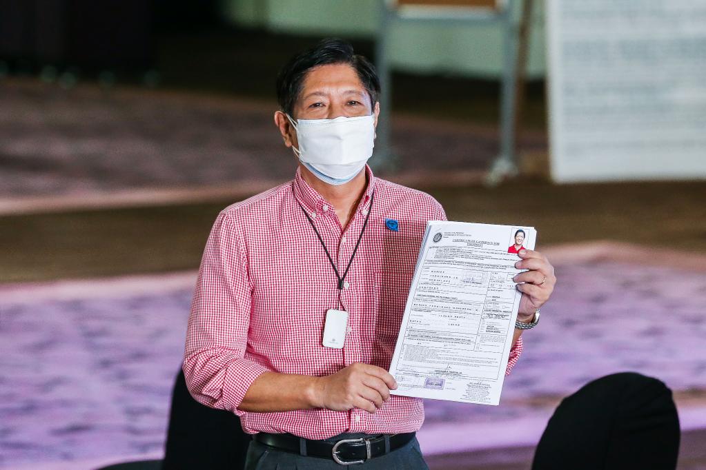10月6日,菲律宾前总统费迪南德·马科斯的独子小费迪南德·马科斯在申请参加2022年5月的总统竞选后,展示了他的候选人证书。 新华社发(乌马利摄)