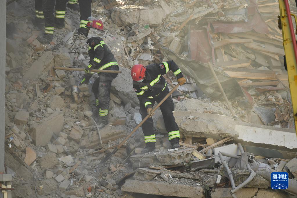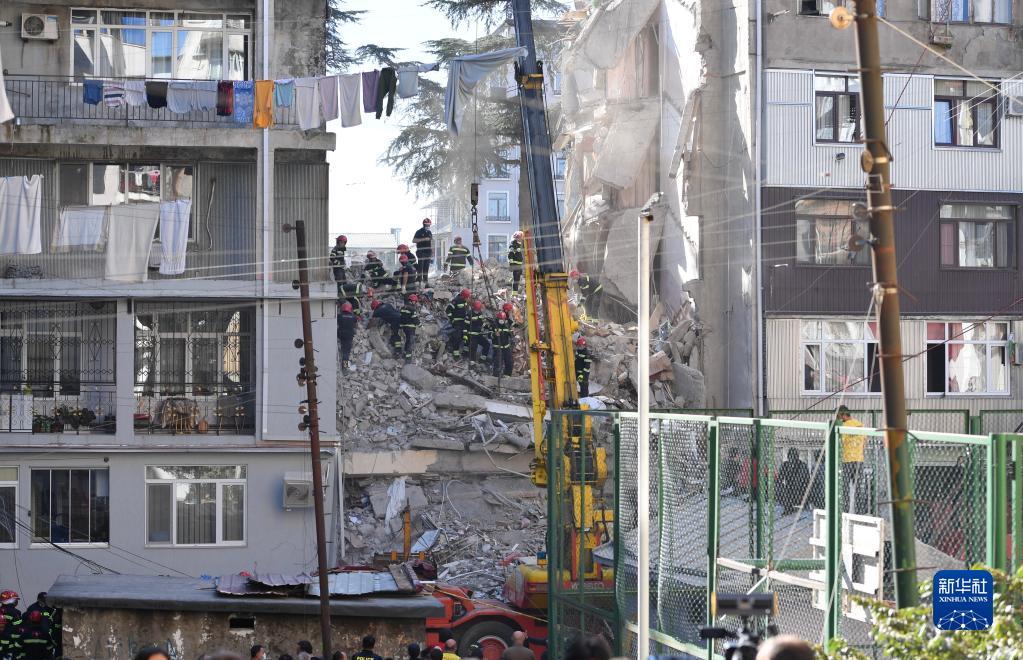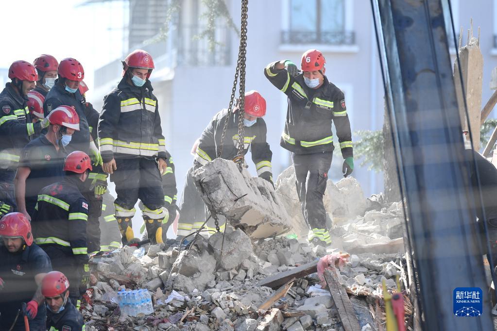10月8日,救援人员在格鲁吉亚西部城市巴统的楼房垮塌事故现场搜救被困者。新华社发(塔姆娜摄)