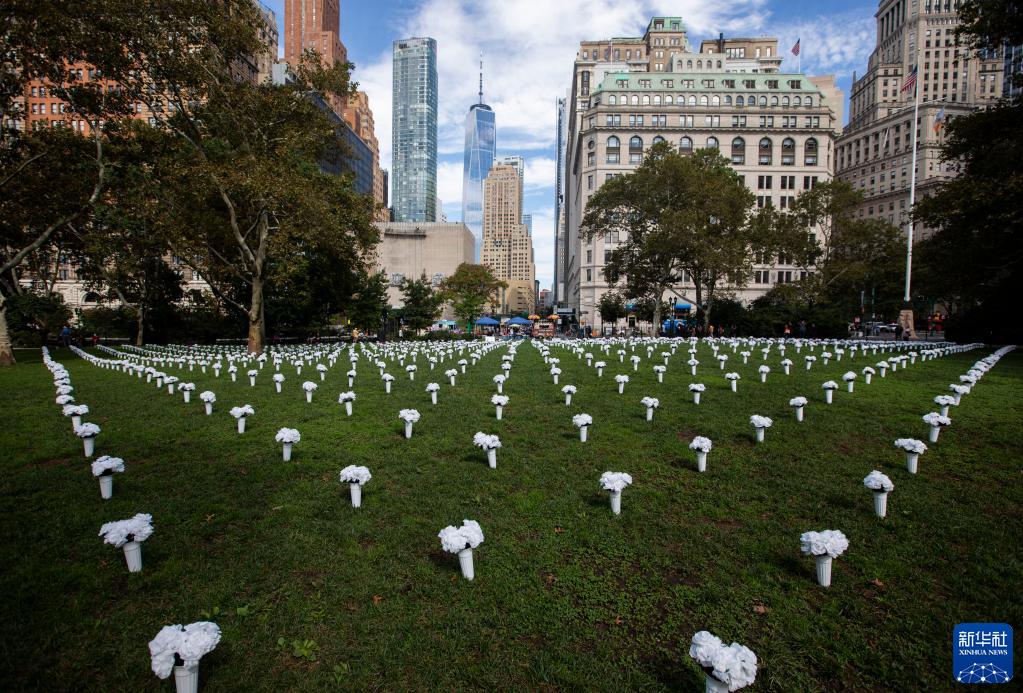 据主办方介绍,这个由1050个白色瓶花组成的大型纪念装置旨在悼念2020年在纽约州死于枪支暴力的1050名受害者,呼吁政府针对枪支暴力采取行动。