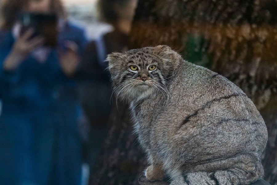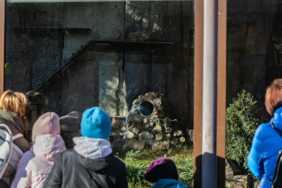 ↑10月6日,人们在俄罗斯莫斯科动物园观看兔狲。新华社记者白雪骐摄