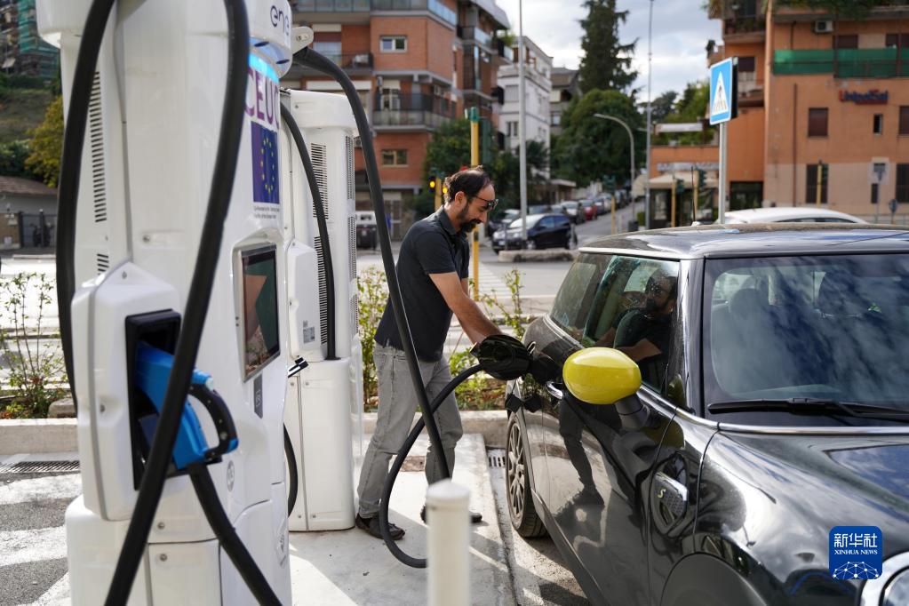 10月9日,一名男子在位于罗马的意大利国家电力公司设立的Enel X快充站为车辆充电。