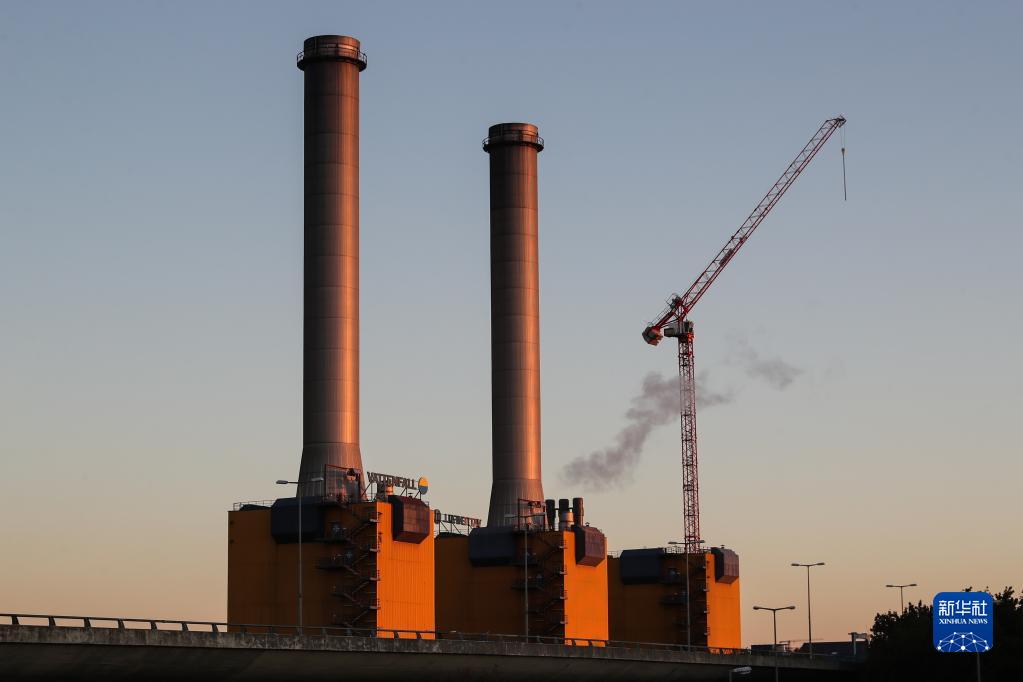 这是10月9日在德国首都柏林拍摄的一座正在拆除烟囱的热电厂。该热电厂为实现碳中和目标在拆除厂内的三座烟囱及锅炉房。