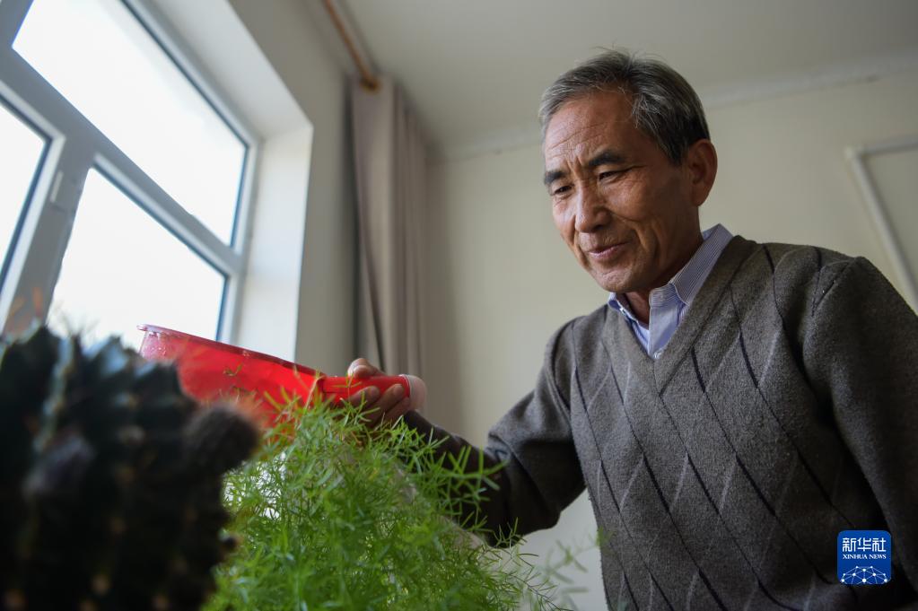 10月11日,在额济纳旗七道桥管护站,护林员魏存广给自己养的绿植浇水。新华社记者 李志鹏 摄